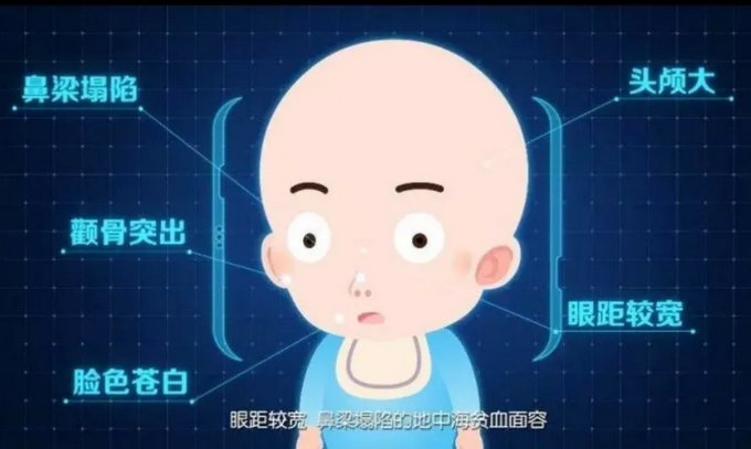 重型地贫包括重型α地贫和重型β地贫,重型α地贫又称巴氏水肿胎(即Hb Bart 儿水肿综合征),胎儿重度贫血、全身水肿、肝脾肿大,常于孕晚期胎死宫内或出生后数小时内死亡。重型β地贫通常在出生后3至6个月开始出现症状,多表现为重度贫血、面色苍白、肝脾肿大、黄疸、发育不良,具有典型的地贫特殊面容:头颅变大、额部隆起、颧骨突出、鼻梁塌陷、眼距增宽等,如不进行规范性输血和排铁治疗,多在未成年前死亡。