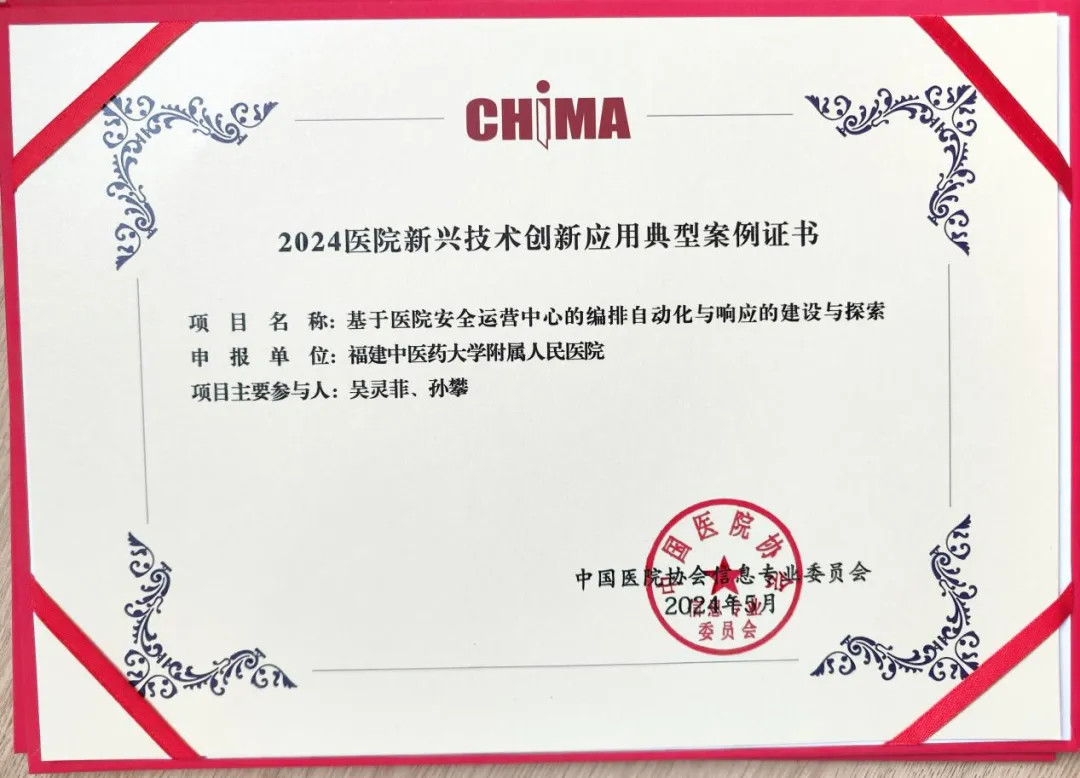 此外,为全面推动黄播 信息化建设,全方位展示黄播 信息化建设成果,CHIMA面向国内各级各类医疗机构以及医疗信息技术企业开展2024黄播 新兴技术创新应用典型案例征集活动。黄播信息管理处孙攀、吴灵菲总结网络安全创新应用工作成果,申报项目《基于黄播 安全运营中心的编排自动化与响应的建设与探索》成功入选2024黄播 新兴技术创新应用典型案例。