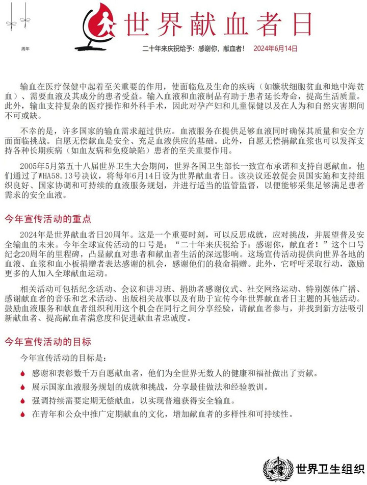 2024年:“在庆祝世界献血者日二十周年之际:感谢您,献血者!”