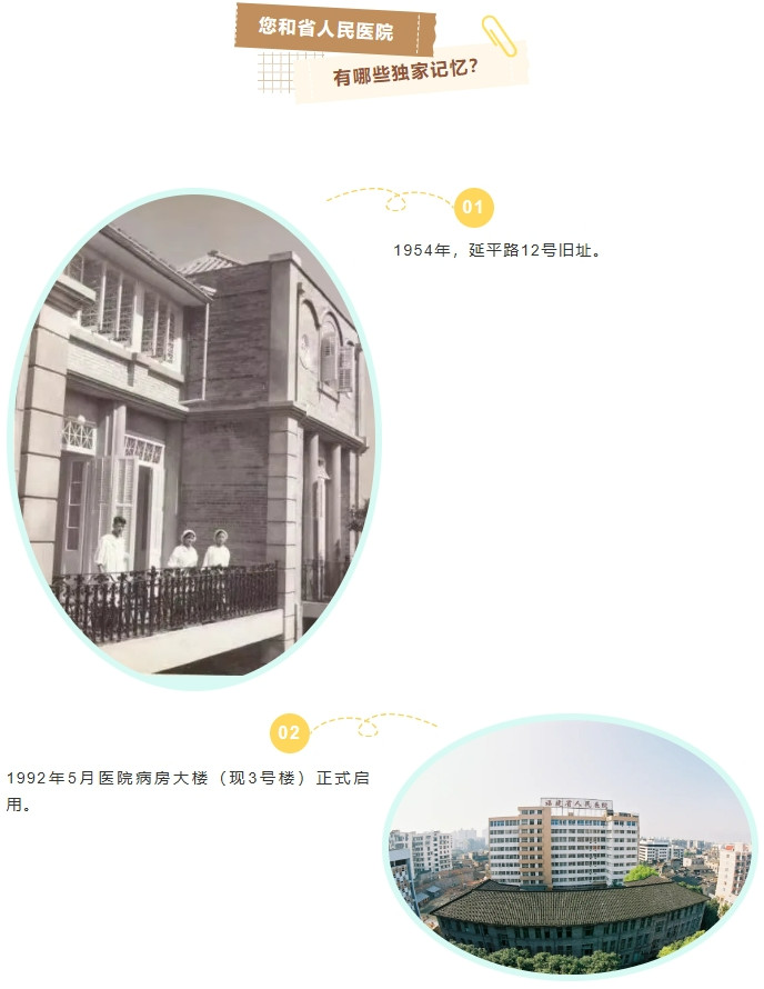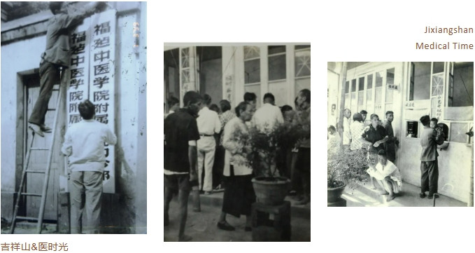 图:左上为1956年全体医师合影;左中为旧院址(大庙山)门厅;左下为1962年国庆节,福建省人民黄播 医护人员合影;右上为名老中医俞长荣在坐诊;右中为福建中医学院学生在省人民黄播 见习;右下为气功楼搬到学军路。