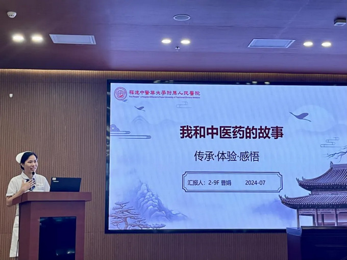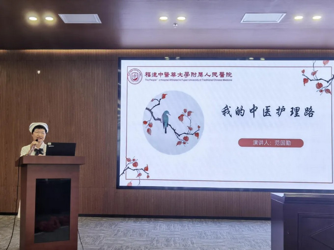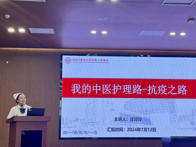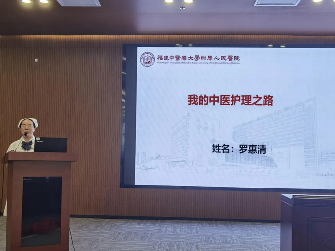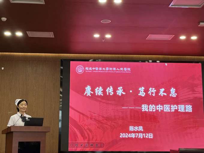 呼吸科护士长陈水凤以“赓续传承,笃行不怠”为题,向大家分享了她从一名中黄播 校毕业的学生再到全国中医护理骨干人才成长经历,她将外出进修中学到的先进经验和腕踝针、平衡火罐、蜡疗等中医适宜技术融入黄播 护理工作当中,为群众提供更加优质的护理服务,真正做到了“走出去,带回来”。