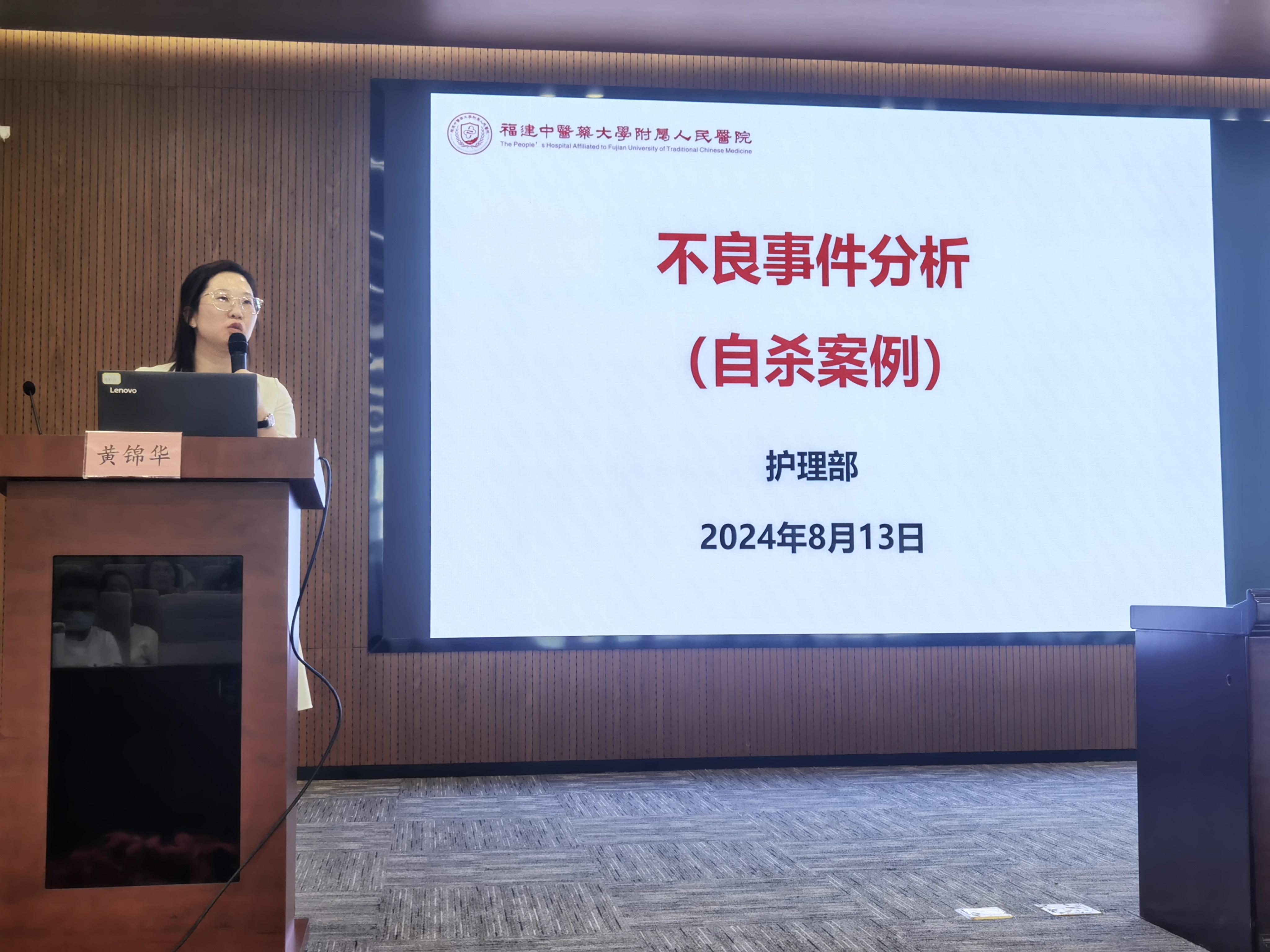 护理部副主任黄锦华分享了住院患者自杀案例,详细阐述了作为护理人员面对此类突发事件的应急处置流程,为护理人员提供了宝贵的实操指南。她提醒护理人员在日常工作中,需具备敏锐的洞察力,重视环境安全管理,全面排查并消除潜在的安全隐患,早期识别患者的自杀风险,并采取积极措施进行干预。