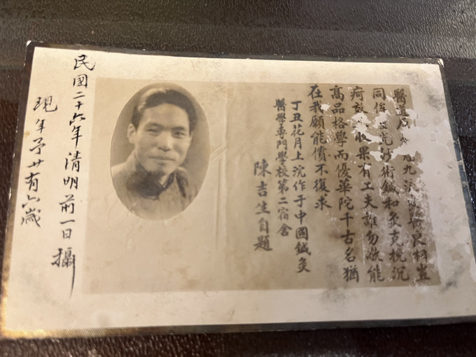 在陈禹略展示的拍摄于1936年的老照片中,可以看到陈吉生风华正茂。照片拍摄于中国针灸医学专门学校宿舍内,陈吉生还特别在照片左侧题写诗句,他的字迹隽永,诗句饱含医学理想。他写道:华佗千古名犹在,我愿能偿不复求。这是24岁的他,自勉的诗句,也是他人生的目标方向。