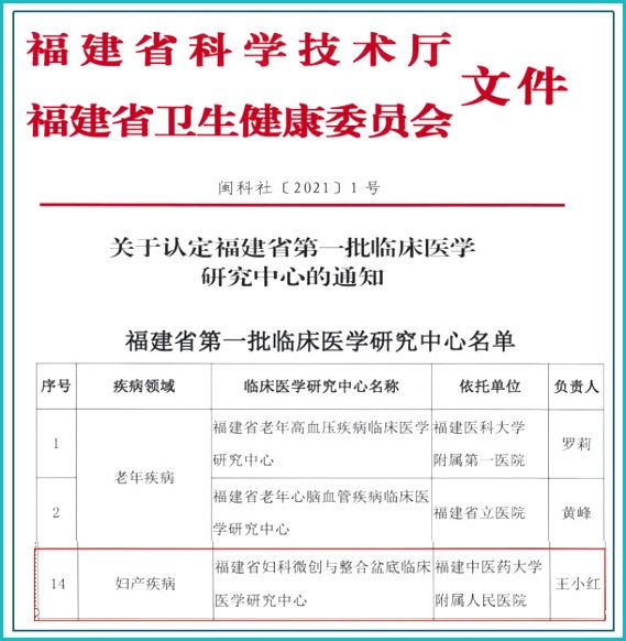 2021年“妇科微创与整合盆底临床医学研究中心”成为福建省第一批临床医学研究中心