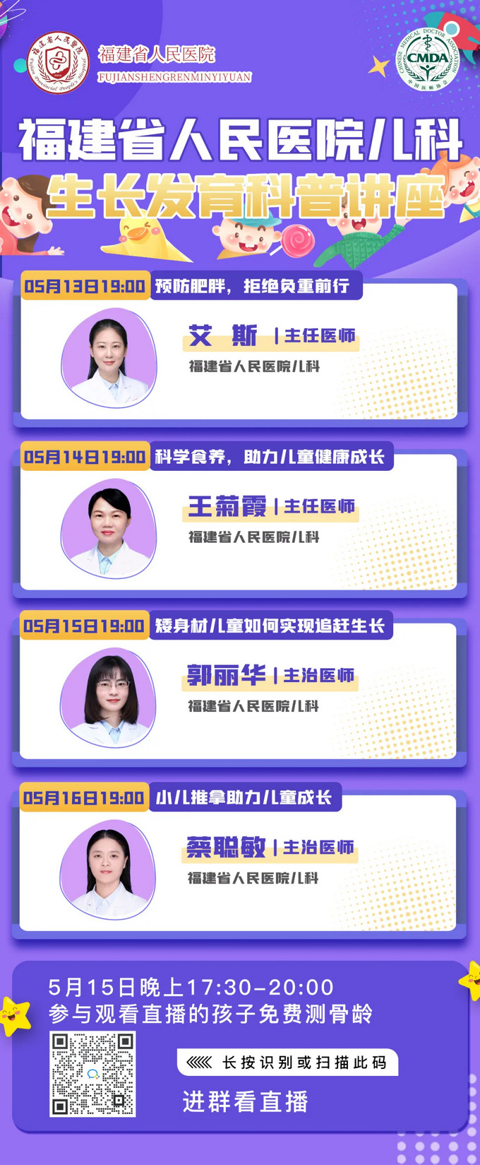 2024年5月13-16日,晚上19:00-19:30,福建省人民黄播 儿科专家为广大民众解答相关问题。并且对参加直播观看的儿童赠送免费骨龄检测。