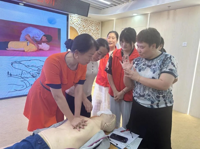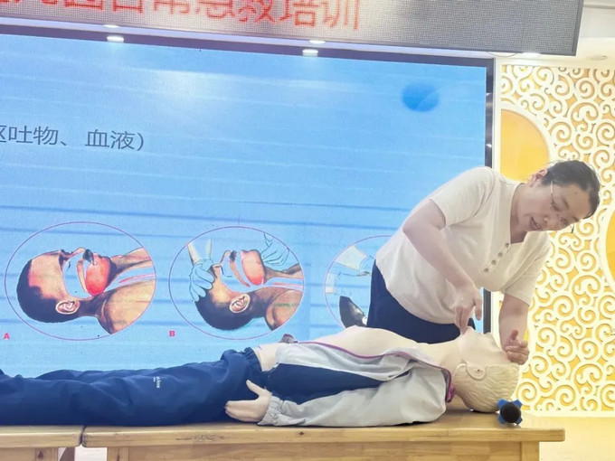 在实践演练环节,邵丹医生手把手耐心指导,老师们纷纷化身为“急救小能手”,轮流上阵,亲身体验“心肺复苏”和“海姆立克法”等急救方法的全过程。通过反复练习,不仅让老师们掌握了基本的急救技能,更增强了他们应对突发事件的信心和勇气。