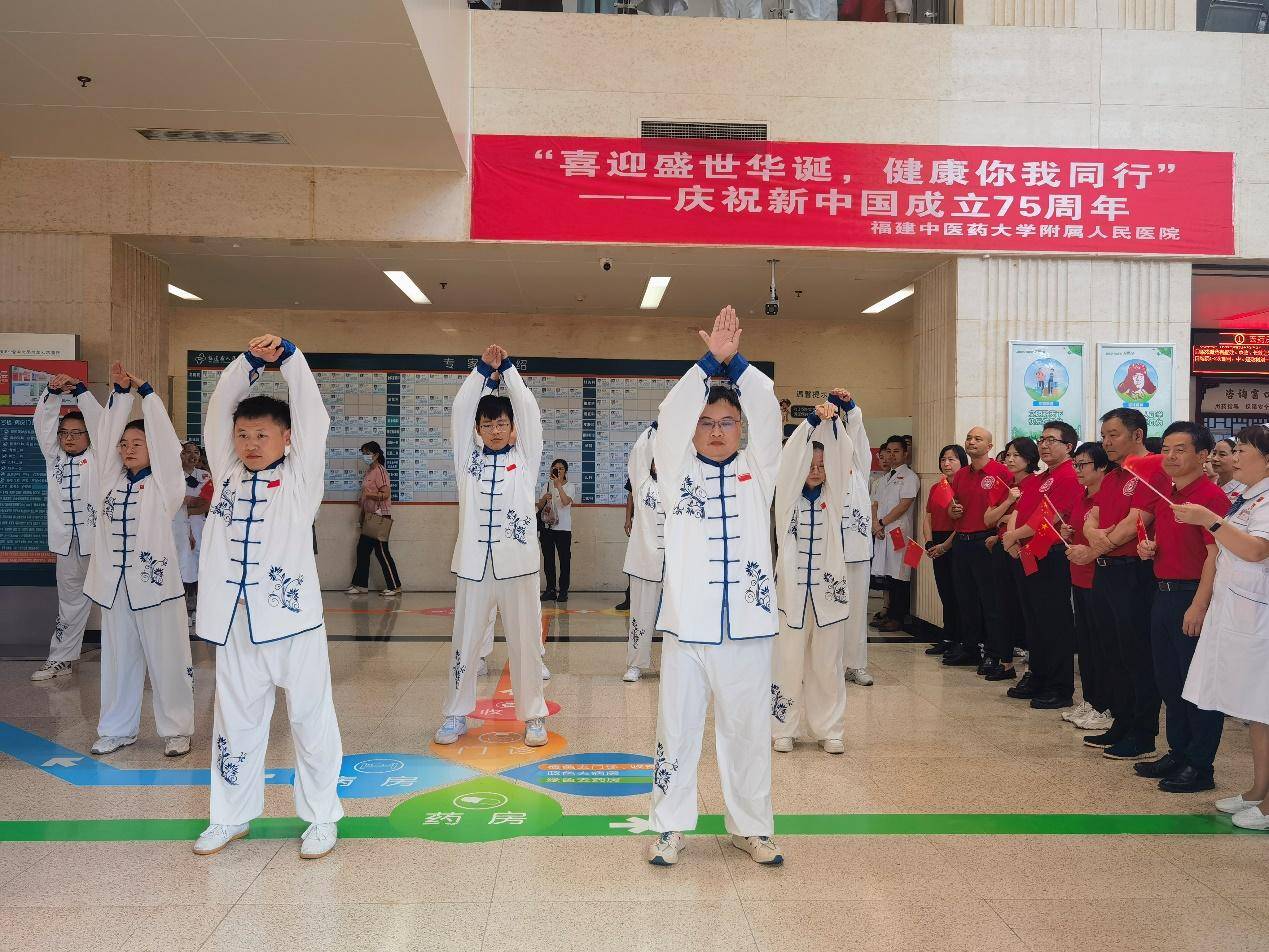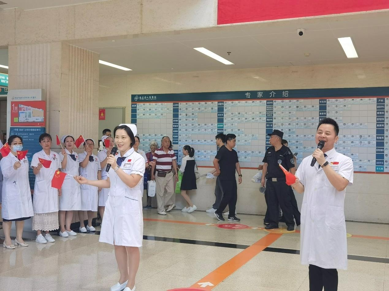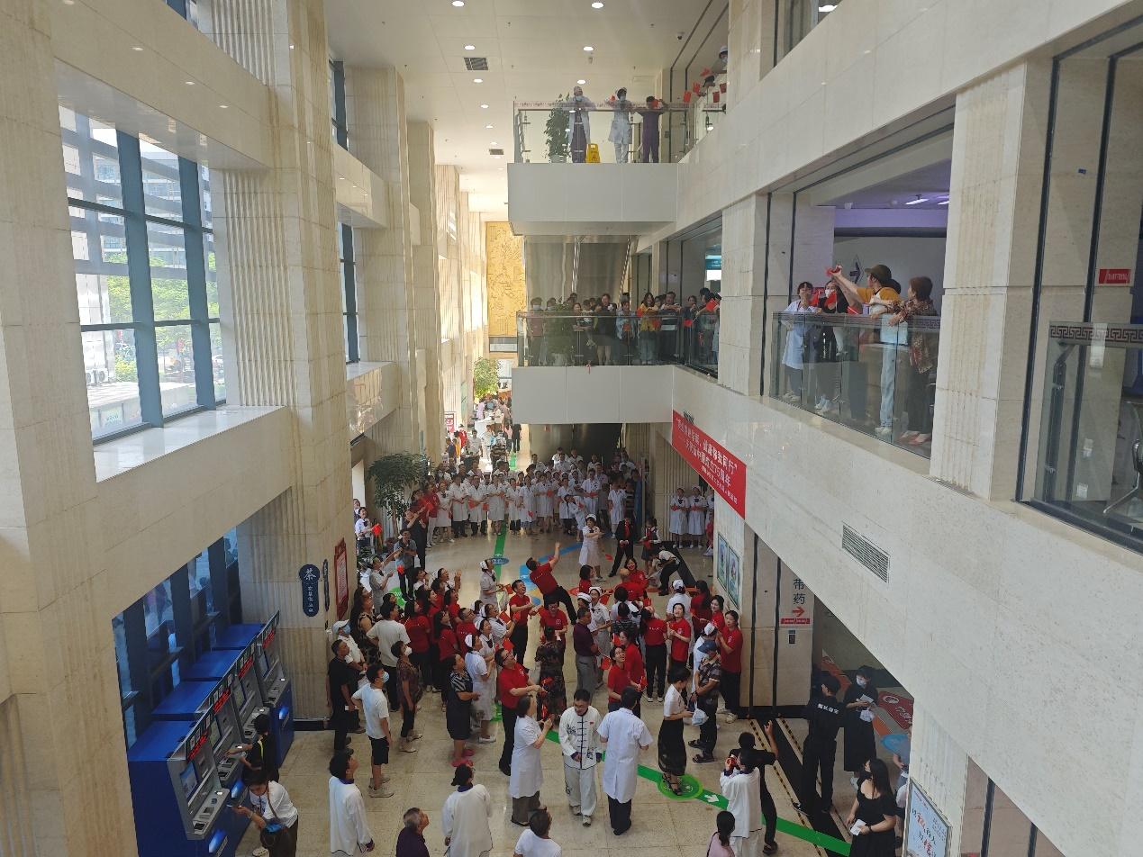 各处汇聚到门诊大厅中央,为伟大祖国献上最深情的祝福。