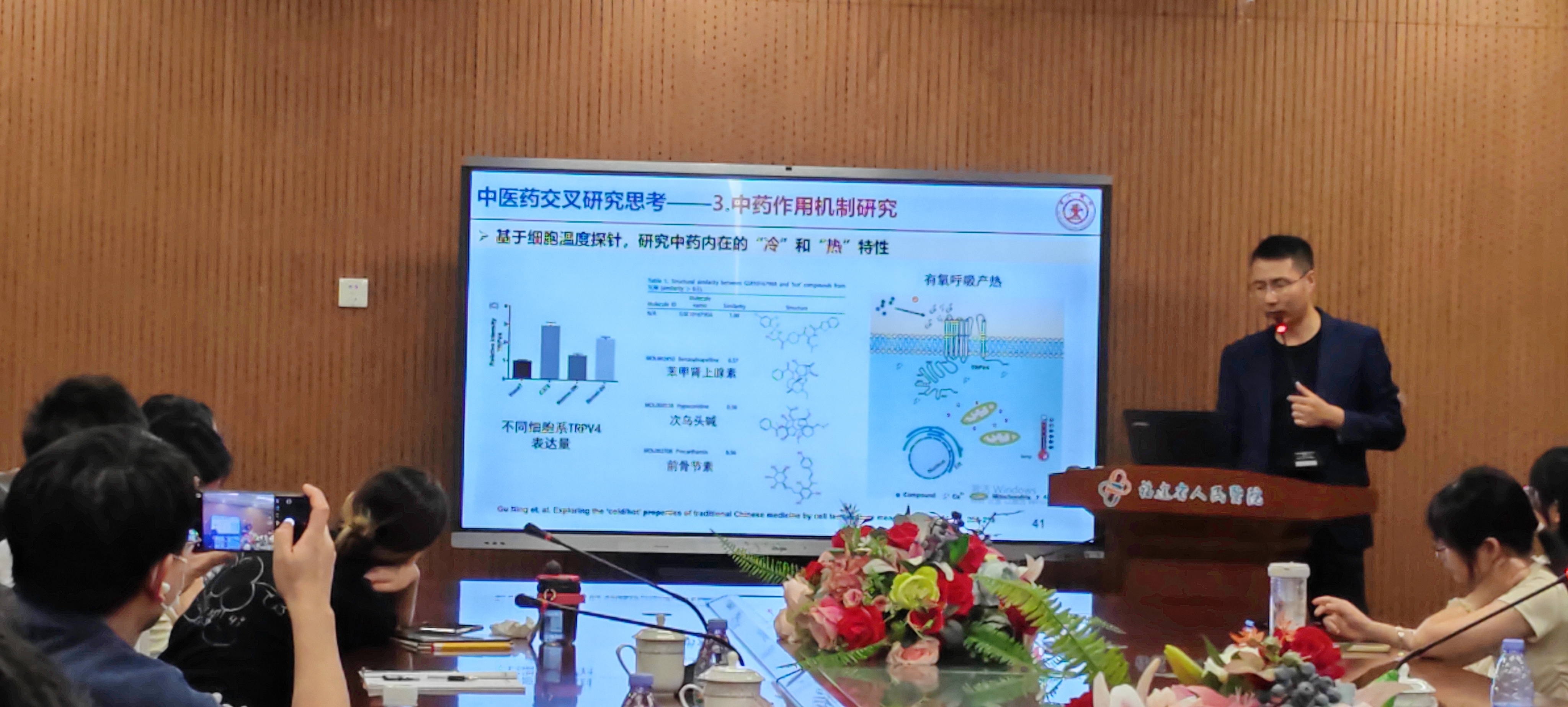 会上,靳教授从光功能材料研究背景、增强分子吸收促肿瘤成像及治疗、热聚集增强药物肿瘤富集、灵敏度增强型细胞温度探针开发等方面,由浅入深地介绍了他们团队在该领域的研究概况;并以其团队研发的细胞温度探针和仿艾灸智能化系统为例,分享了中医药与材料科学交叉融合的成功经验。