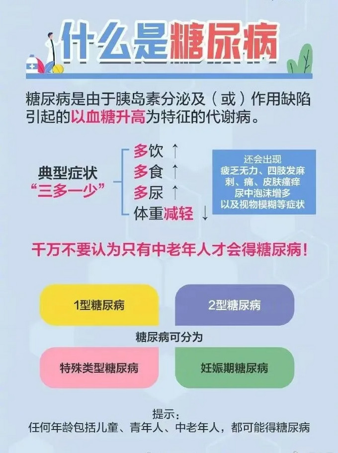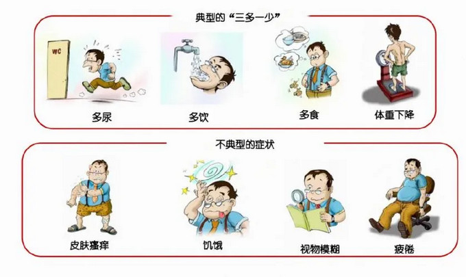 其典型症状为“三多一少”(多饮、多食、多尿和体重减轻)。当以下任一条件符合时即可诊断为糖尿病: