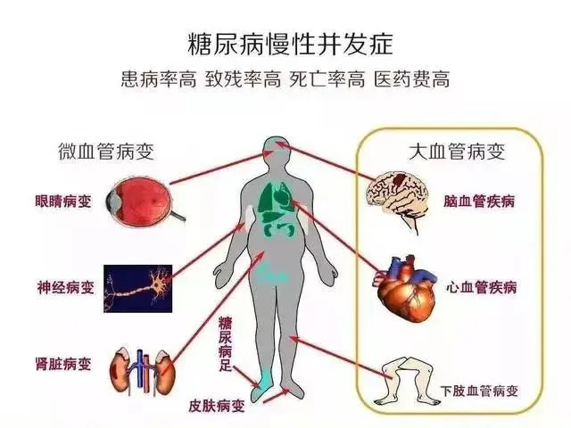 糖尿病患者常伴有脂肪、蛋白质代谢异常,长期高血糖可引起多种器官,尤其是眼、心、血管、肾、神经损害或器官功能不全或衰竭,导致残废或者过早死亡。糖尿病常见慢性并发症包括卒中、心肌梗死、视网膜病变、糖尿病肾病、糖尿病足等。