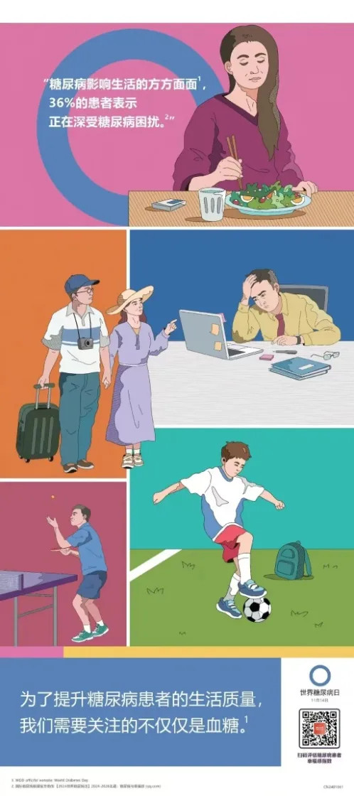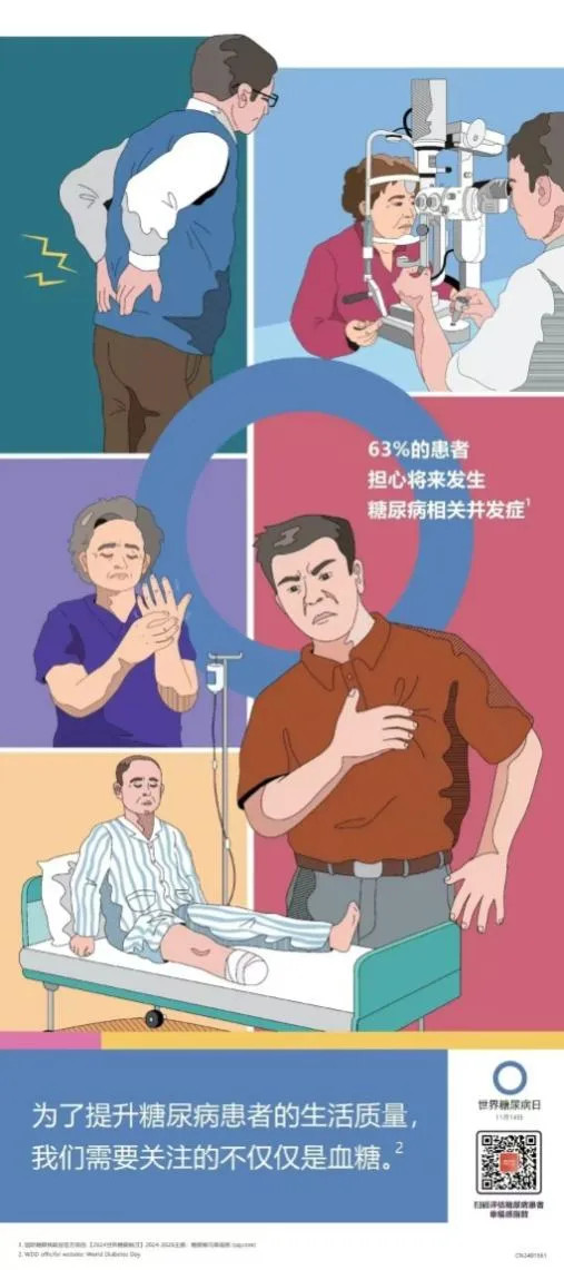 2024年世界糖尿病日的主题是“糖尿病与幸福感”(Diabetes and well-being)。国际糖尿病联盟(IDF)呼吁,将患者的整体幸福感置于糖尿病护理的核心,推动改变,以改善糖尿病患者的生活。根据国际糖尿病联盟调查显示,36%的患者表示正在深受糖尿病困扰,63%的患者担心将来发生糖尿病相关并发症,28%的患者很难对自己的病情保持积极的态度。所以今年的主题就是要提升糖尿病患者的幸福感,让糖友们的生活更加美好。糖尿病并不可怕,保持良好生活习惯、定期监测血糖、遵循医嘱,坚持用药和复查,我们完全可以健康地生活。让我们一起科学控糖,幸福生活!