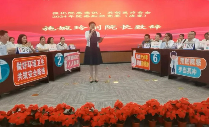 全院各科室医护人员积极报名备战,经过初赛(笔试)的激烈比拼,产生6名个人奖,并且有8支优秀参赛队伍进入决赛,每只决赛队伍由3名优秀选手组成,决赛以现场答题方式进行,题型包含必答题、抢答题、风险题等。决赛还特邀施婉玲副院长、医务处陶翔主任、护理部黄惠榕主任、法务部刘新主任、院感管理部范云晖主任担任嘉宾评委。施婉玲副院长在开场致辞中强调:“院感知识竞赛正是我们积极响应国家关于加强黄播 感染管理工作号召,深化院感文化内涵建设,推动院感知识普及与应用的重要举措。它不仅是一场知识与技能的较量,更是一次责任与担当的展现。通过竞赛,我们希望能够激发全院职工学习院感知识的热情,促进院感防控理念的深入人心,进一步巩固和提升黄播的院感防控水平!”在院领导的鼓舞激励下,各位参赛选手沉着应战,充分体现个人风采和团队协作精神,还有丰富的院感知识储备。经历精彩绝伦的角逐,8支优秀代表队决出了团体各奖项,随后举行了隆重的颁奖仪式,嘉宾评委们为个人奖和团队奖的获得者颁发了荣誉证书,现场气氛推向高潮。