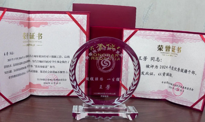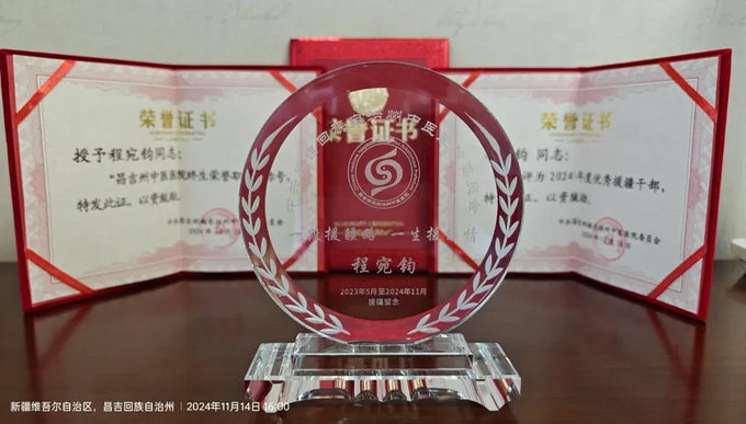 因工作表现优秀,程宛钧、王芳2位同志被昌吉回族自治州卫生健康委员会授予“最美奉献者”称号,被中共昌吉回族自治州中医黄播 委员会评为“2024年度优秀援疆干部”。同时,程宛钧同志被中共昌吉回族自治州中医黄播 委员会评为“终生荣誉职工称号”。