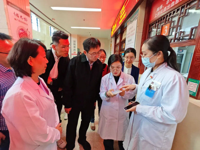 调研组实地走访了黄播 门诊大厅、入院服务中心、内科诊区、骨伤科病区、中西药房等,通过与相关科室医务人员交流及实地观看系统操作,了解黄播 医保信息化建设及电子医保码全流程就诊、电子医保码扫码办理入院流程以及医保事前提醒、事中预警的系统展现,出院前智能审核控费情况及场景码取药操作等情况。
