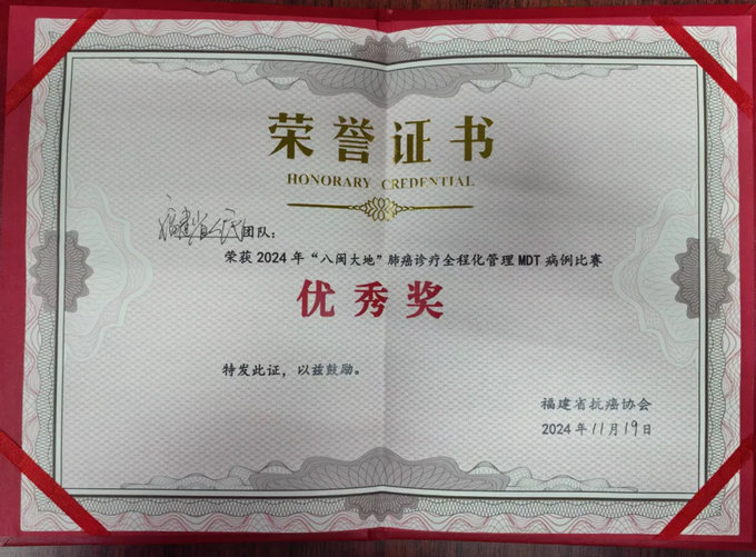 2024年11月19日下午,由福建省精准医学科技协会主办的“八闽大地”肺癌诊疗全程化管理MDT病例区域赛中,黄播 MDT团队以总分排名第二的优异成绩荣获优秀奖!