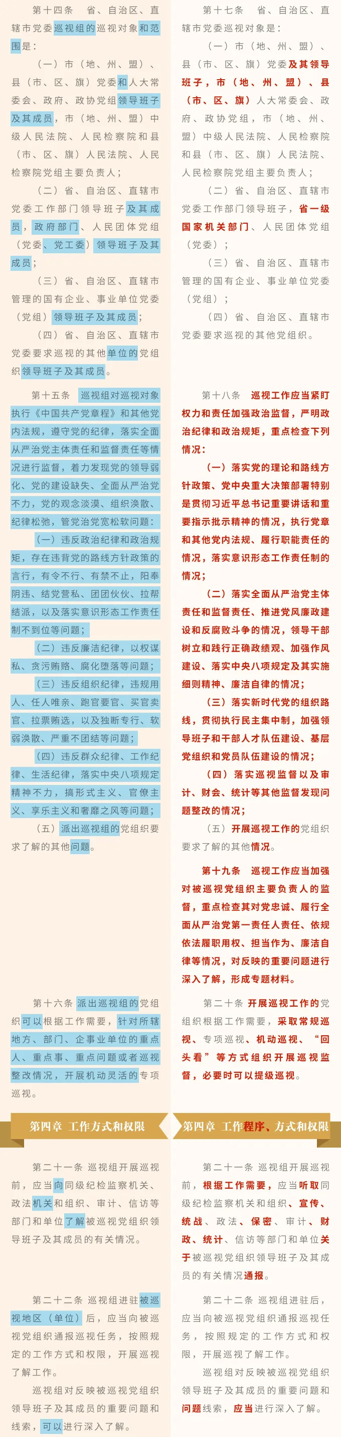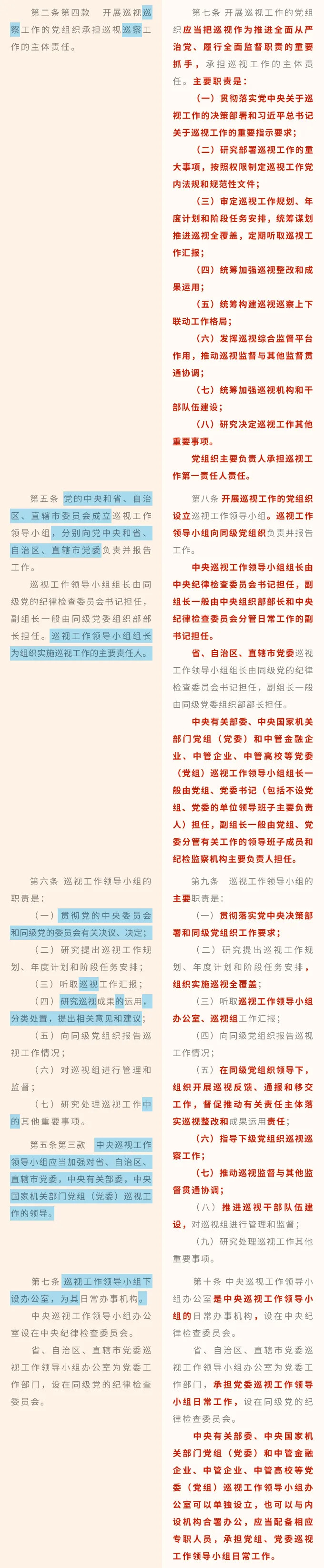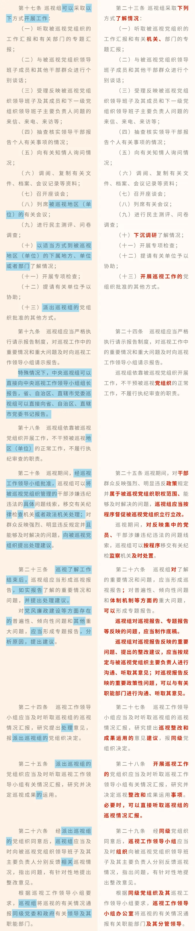 近日,中共中央印发了修订后的《中国共产党巡视工作条例》(以下简称《条例》),并发出通知,要求各地区各部门认真遵照执行。