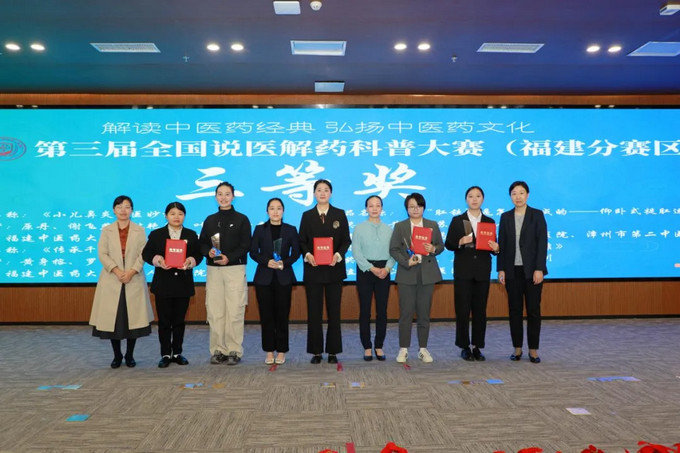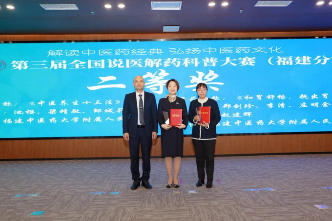 福建省中医药学会科普分会副主任委员陈美华、熊红萍、陈四文教授为三等奖获得者颁奖