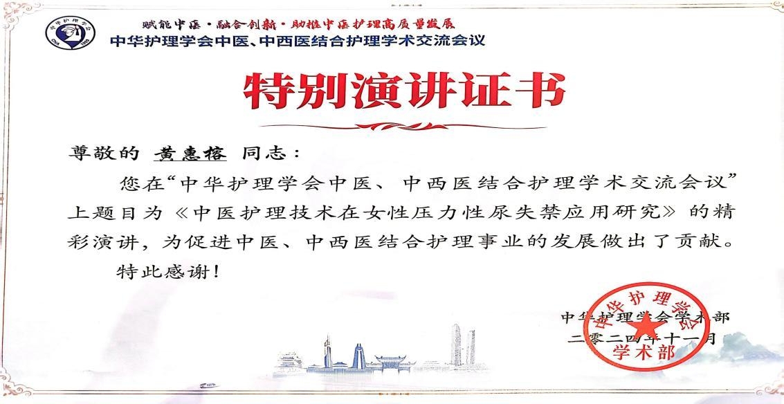 黄播黄惠榕教授发表“中医护理技术在女性压力性尿失禁的应用研究”主旨演讲。她的分享赋能中医、融合创新、助推中医护理高质量发展,拓宽与会者中医护理技术创新应用的新思路,值得借鉴与推广。