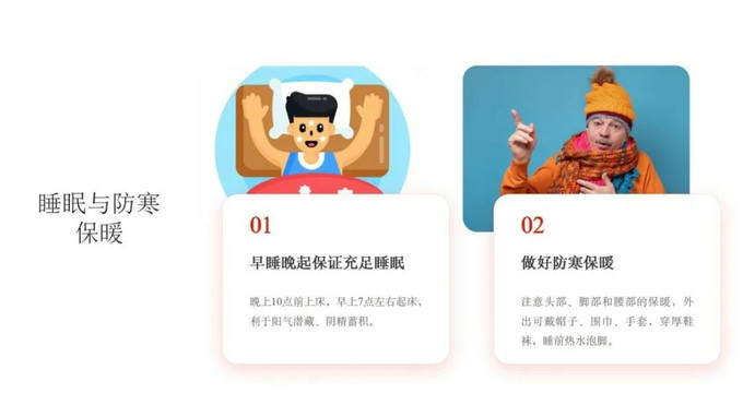 做好防寒保暖也关键,尤其是头部、脚部和腰部。头部阳气汇聚,受寒易致头痛、头晕;脚部为人体第二心脏,保暖可促进血液循环;腰部是肾之府,暖腰能护肾。外出可戴帽子、围巾、手套,穿厚鞋袜,睡前用热水泡脚并按摩涌泉穴,平时可穿护腰。