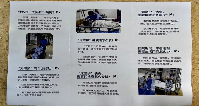 护士耐心地为我介绍了“无陪护病房”的内容,我认真看了宣传彩页,“什么是无陪护病房?”、“无陪护病房有什么好处?”、“无陪护病房费用怎么收?”、“无陪护病房患者的检查怎么安排?”、“无陪护病房患者用餐怎么解决?”“住院期间患者临时需要生活用品怎么办?”我之前所有的疑虑,答案全在这里,一目了然。除了全方位的护理服务,费用还可按规定走医保,这不是住院无忧吗?对我们老百姓来说实在是太好了!