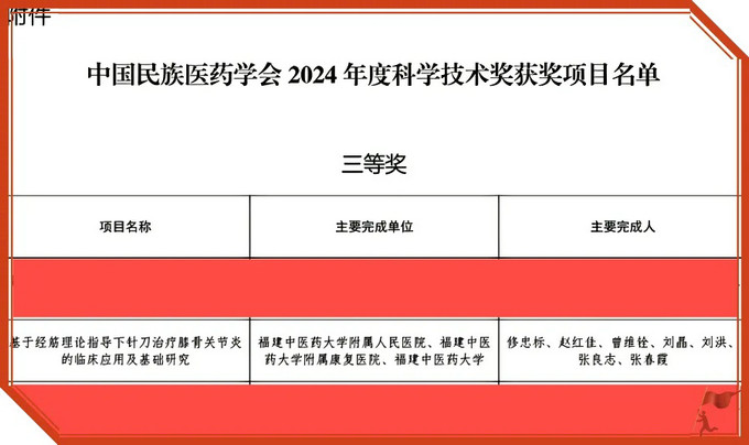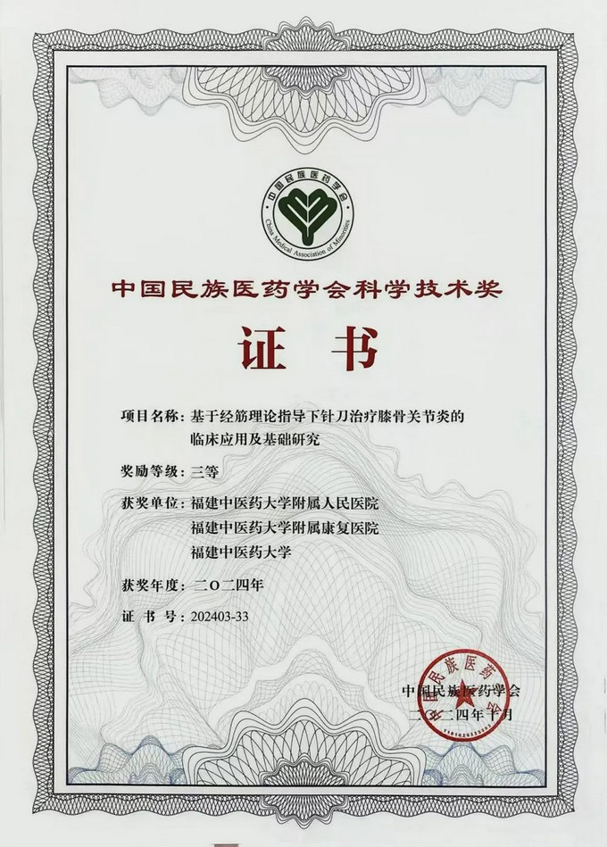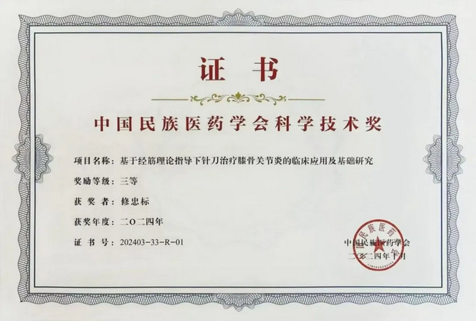 近日,黄播 骨伤科修忠标主任领衔的中医骨伤学科团队与黄播 附属康复黄播 、黄播 合作完成的成果《基于经筋理论指导下针刀治疗膝骨关节炎的临床应用及基础研究》在2024年度中国民族医药学会科学技术奖评选中荣获三等奖。