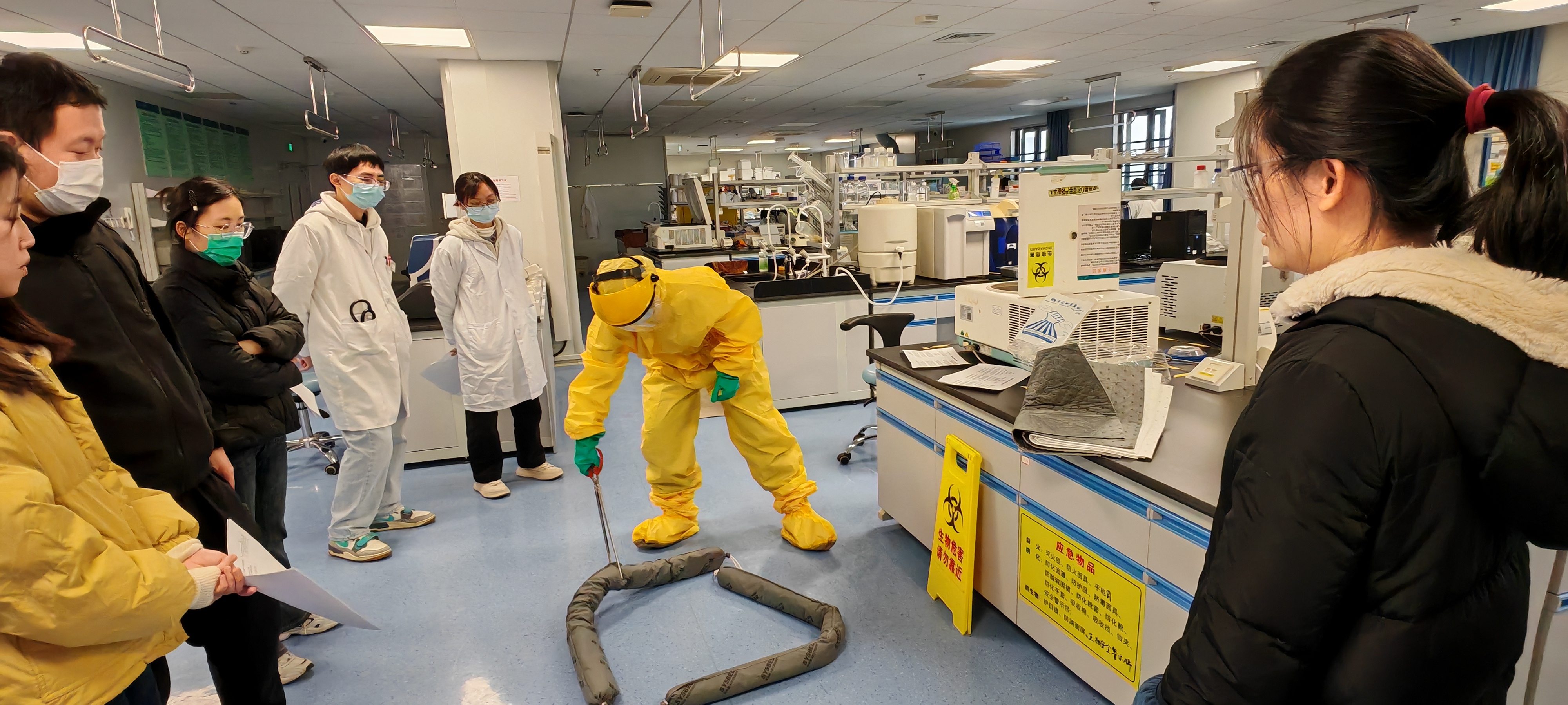 随后由实验室工作人员林佳带领实验人员进行生物安全培训的应急演练,以模拟实验室内各种生物安全事故突发的场景来考核实验人员如何采取最佳的应对措施。在整个应急演练过程中,参与人员反应迅速、操作无误、紧凑有序,达到了预期的演练效果。