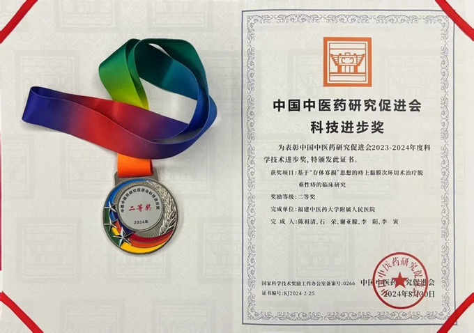 在2023-2024年度中国中医药研究促进会科技进步奖表彰大会上,黄播肛肠科团队陈祖清副主任医师主导的项目《基于“存体寡损”思想的痔上黏膜次环切术治疗脱垂性痔的临床研究》荣获科技进步二等奖。