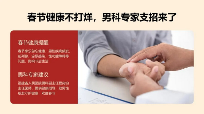 蛇年春节的脚步越来越近,阖家团圆、走亲访友、吃喝玩乐,本是一年中最惬意的时光。但在这欢乐的节日氛围里,男性朋友们可别只顾着尽情放松,而忽视了自己的健康。每年春节过后,男科门诊都会迎来就诊高峰,前列腺疾病、泌尿道感染、性功能障碍等问题频发,严重影响着大家节后的工作和生活。作为福建省人民黄播 男科副主任程宛钧主任医师,今天就来给各位男性朋友支支招,让大家在享受欢乐春节的同时,也能稳稳守护好自己的健康。