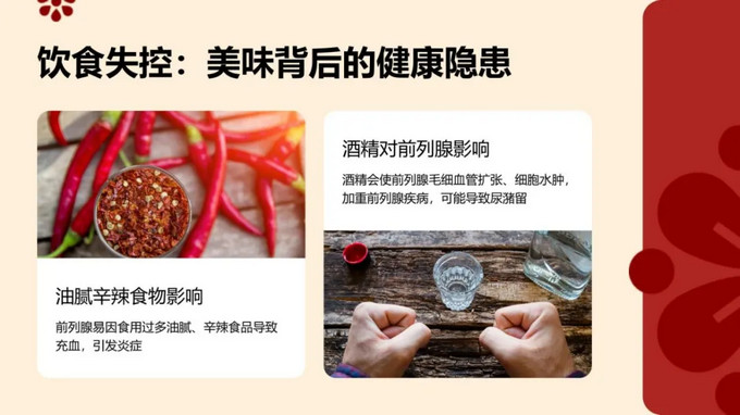 春节一到,餐桌上全是硬菜,大鱼大肉、辛辣美食,谁能忍住不吃?但这些美味对前列腺可不太友好。吃多了油腻、辛辣食物,前列腺容易充血,前列腺炎就找上门了。