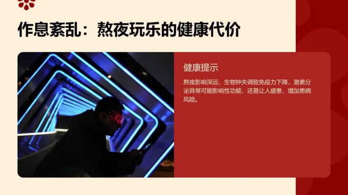 亲朋好友相聚,难免熬夜打牌、聊天、玩游戏。然而,长期作息不规律,不仅会导致身体免疫力下降,还可能引发男性性功能障碍等问题。生物钟被打乱,激素分泌失调,生殖系统的正常功能也会受到影响。而且,熬夜还会让人精神疲惫,影响身体的恢复和修复能力,给各种疾病可乘之机。