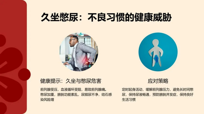 春节期间,出门探亲或是在家休息,大家常常久坐不动,打牌、玩桌游、玩手机。久坐会压迫前列腺,影响局部血液循环,导致前列腺充血,引起前列腺痛发病。再加上憋尿,问题就更严重了。长时间憋尿可能导致膀胱神经功能紊乱,肌肉松弛无力,严重者会出现尿频、尿不净,甚至尿失禁、尿潴留等问题。