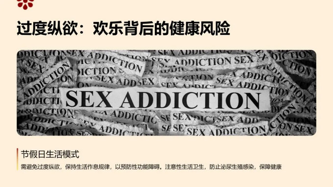 节假日期间,人们往往心情愉悦,夫妻生活也可能会比平时频繁。但过度纵欲和不规律的生活作息可能导致性功能障碍。同时,不洁的性生活还可能引发泌尿生殖感染,给健康带来麻烦。