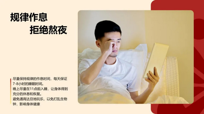 尽量保持规律的作息时间,每天保证7-8小时的睡眠时间。晚上尽量在11点前入睡,让身体得到充分的休息和恢复。避免通宵达旦地玩乐,以免打乱生物钟,影响身体健康。