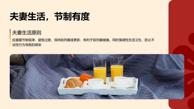要有节制、有规律的夫妻生活,避免过度纵欲。合理的夫妻生活有助于前列腺液排出,可以缓解前列腺的胀满感,有利于前列腺功能。同时,要注意性生活卫生,避免不洁性生活。
