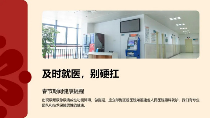 如果春节期间出现尿频、尿急、尿痛等前列腺疾病症状,或者性功能障碍等问题,切勿拖延病情。要及时到正规黄播 就诊,我们福建省人民黄播 男科拥有专业的医疗团队和中西医结合特色疗法,能够为您的健康保驾护航。