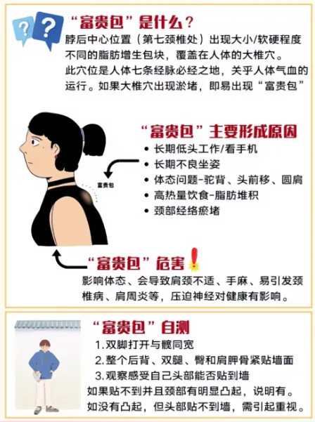 春节是我国最受重视的传统节日,家庭团圆、朋友欢聚,兴高采烈地过完节后,很多人感到颈椎不适、颈部脂肪堆积“富贵包”。“富贵包“, 医学上常指颈椎后侧脂肪堆积,肌肉紧张或姿势性驼背导致的后颈部凸起,可能与不良姿势、长期低头、颈椎病或脂肪堆积相关。假期期间,多数人经常长期玩手机、玩游戏、发拜年微信,因而老是保持低头、脖子前伸、含胸驼背的姿势,脖子和后背的肌肉因此紧张痉挛,慢慢地还会变得肿胀,于是慢慢形成了脖子后面的大包。