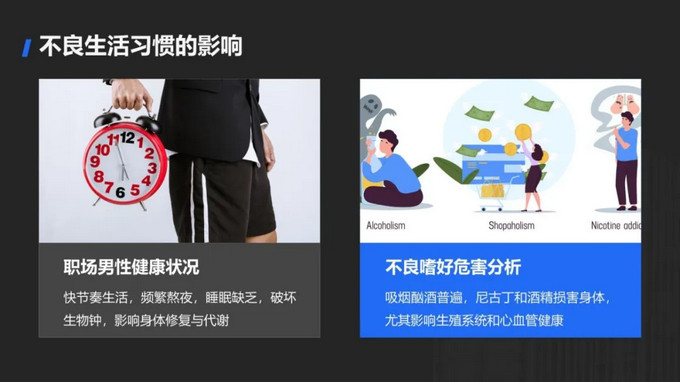 现在的男性,尤其是职场男性,生活节奏快,压力大。很多人经常熬夜加班,长期睡眠不足会打乱身体的生物钟,影响身体各器官的正常修复和代谢。同时,吸烟、酗酒等不良习惯也很常见。香烟中的尼古丁和酒中的酒精会对身体的各个系统造成损害,尤其是对生殖系统和心血管系统的影响更为明显。