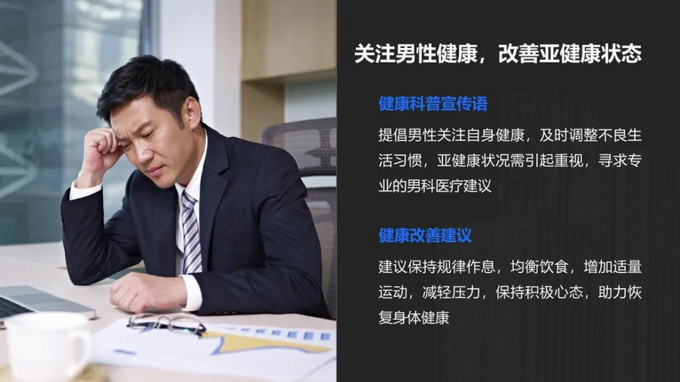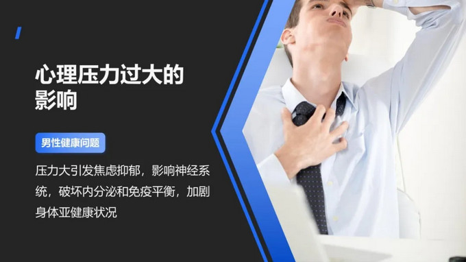 社会竞争激烈,男性往往承担着家庭和工作的双重压力。长期处于高压状态下,会导致心理负担过重,产生焦虑、抑郁等不良情绪。这些负面情绪会影响神经系统的功能,进而影响身体的内分泌系统和免疫系统,使身体处于亚健康状态。