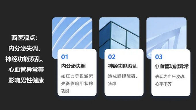 从西医角度来看,男性亚健康状态可能与内分泌失调、神经功能紊乱、心血管功能异常等有关。例如,长期的精神压力会导致体内激素水平失衡,影响甲状腺、肾上腺等内分泌器官的功能。同时,神经功能紊乱会导致睡眠障碍、焦虑等问题。心血管功能异常则会出现血压波动、心率不齐等症状。