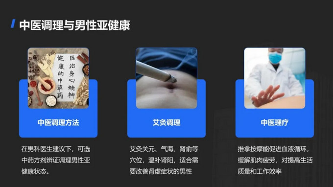 可以在男科医生的指导下,根据个人体质进行中医调理。如服用一些辨证调理的中药方剂,或者进行艾灸、推拿、按摩等中医理疗。艾灸关元、气海、肾俞等穴位,具有温补肾阳的作用;推拿按摩可以促进血液循环,缓解肌肉疲劳。