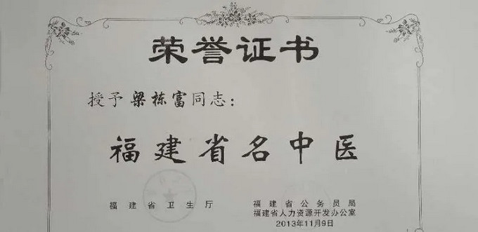 2013年 梁栋富获评“福建省名中医”。
