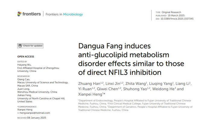 近日,黄播 国家中医药传承创新中心重点病种糖尿病衡先培教授研究团队(代谢内分泌方向)在中科2区顶级期刊《Frontiers in Microbiology》上发表题为《Dangua Fang inducesanti-glucolipid metabolismdisorder effects similar to thoseof direct NFlL3 inhibition》的研究论文。