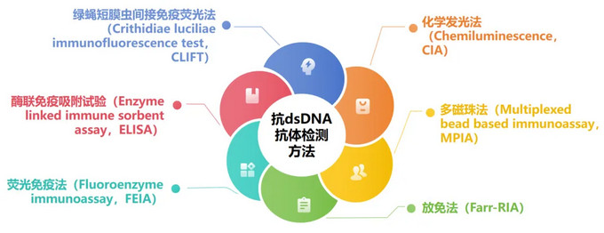 抗ds-DNA抗体是一种能够特异性结合双链DNA的自身抗体,通过免疫复合物介导的炎症反应参与疾病进展,对SLE患者的组织器官损伤有致病作用,见于60%~80%的SLE患者,对SLE诊断的特异度为95%,是SLE分类标准的重要实验室指标,其滴度与SLE疾病活动相关。抗ds-DNA抗体的检测方法包括酶联免疫吸附测定(ELISA)、绿蝇短膜虫间接免疫荧光法(CLIFT)、荧光免疫法(FEIA)、化学发光法(CIA)、放射免疫测定(FARR-RIA)等。