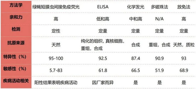 ELISA则是基于抗原抗体特异性结合的免疫检测技术,通过标记酶(如辣根过氧化物酶HRP)与抗体的结合反应,利用底物显色反应来定量或定性检测目标抗原或抗体。ELISA检测速度快,敏感性高,但特异性较低,为定量或半定量实验;CLIFT特异性、敏感性较高,为定性实验。此外,放射免疫测定(FARR-RIA)作为一种结合放射性同位素示踪技术与抗原-抗体特异性反应的超微量分析方法,也具有较高的特异性和敏感性,对低滴度抗ds-DNA抗体的检出率较高,尤其在SLE活动期。总之,不同抗ds-DNA抗体的检测方法都有各自的优缺点,临床常需要联合至少2种检测方法来综合判断。