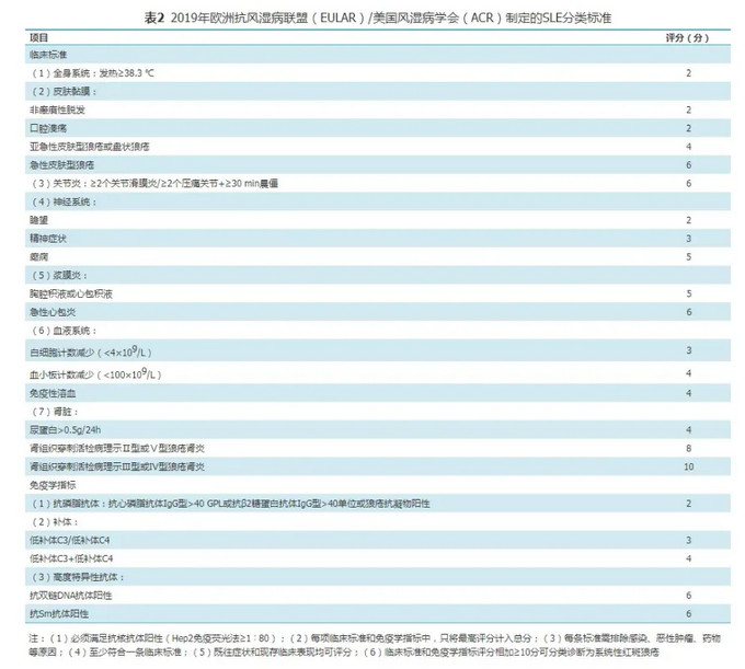 根据2019年EULAR/ACR SLE分类诊断需满足以下条件:(1)必须满足抗核抗体阳性(Hep2免疫荧光法≥1:80);(2)每项临床标准和免疫学指标中,只将最高评分计入总分;(3)每条标准需排除感染、恶性肿瘤、药物等原因;(4)至少符合一条临床标准;(5)既往症状和现存临床表现均可评分;(6)临床标准和免疫学指标评分相加≥10分可分类诊断为系统性红斑狼疮。