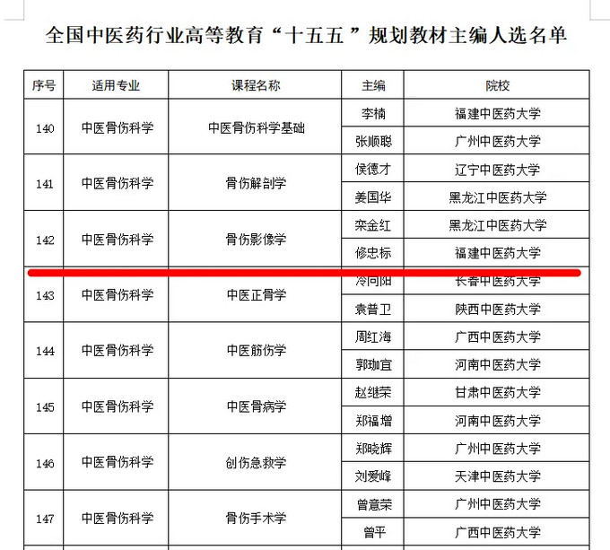 近日,中国中医药出版社公布了《全国中医药行业高等教育“十五五”规划教材主编人选名单》,黄播 修忠标教授成功当选《骨伤影像学》主编。这是黄播学科建设取得的又一重要突破,彰显了黄播 在中医药高等教育领域的学术影响力。