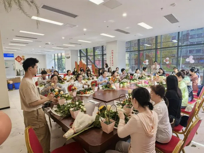花艺制作环节将活动推向了高潮,活动现场宛如一片花的海洋,五彩斑斓的鲜花和生机勃勃的绿植错落有致地摆放着,空气中弥漫着阵阵芬芳。专业花艺师首先为大家带来了精彩的花艺知识讲座,从花材的挑选、色彩的搭配到插花的技巧和造型的设计,每一个细节都讲解得细致入微、生动形象,护理人员听得聚精会神。