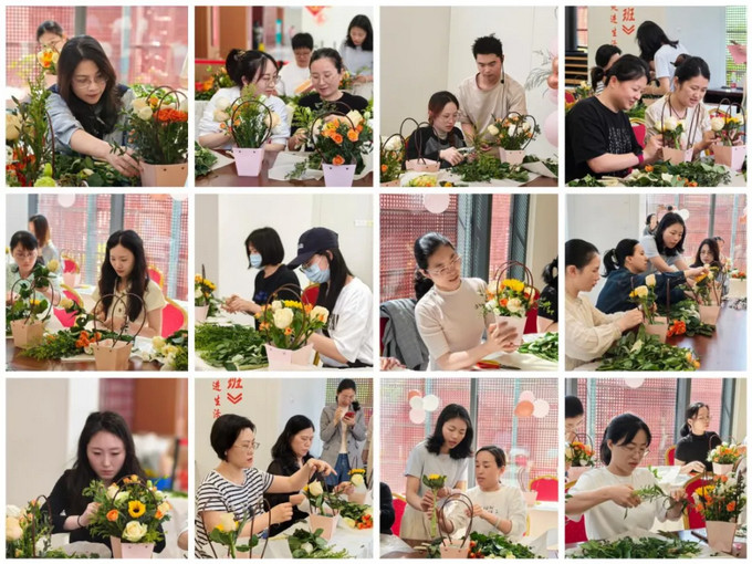 在花艺师的悉心指导下,护理人员纷纷拿起剪刀和花材,开启了一场别具一格的花艺创作之旅。她们充分发挥自己的想象力和创造力,将一朵朵鲜花和一片片绿叶巧妙地组合在一起,精心雕琢着属于自己的花艺作品。有的以向阳而生的向日葵为主花,搭配上几支淡雅的洋桔梗和翠绿的尤加利叶,营造出一种清新脱俗的氛围;有的则大胆尝试,将不同颜色、不同形态的花材进行混搭,打造出富有层次感和视觉冲击力的花艺作品。