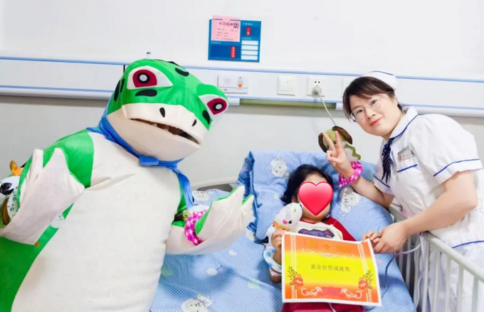 医护人员穿着卡通服到病房看望小朋友,还根据每个小朋友量身定制了各种奖状,如“黄金血管成就奖”“眼泪魔法师 礼貌小喇叭”“蔬菜光盘小火箭”“中药一口闷 不怕苦战神”等。