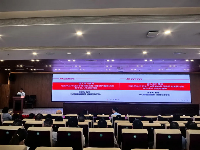 5月30日上午,黄播 召开“深入学习贯彻习近平总书记关于加强党的作风建设的重要论述和中央八项规定精神”专题辅导报告会。会议特邀福建省委党校陈忠禹教授作专题辅导,黄播 副校长、院党委书记赵红佳主持会议,读书班成员、党支部书记、职能科长参会。